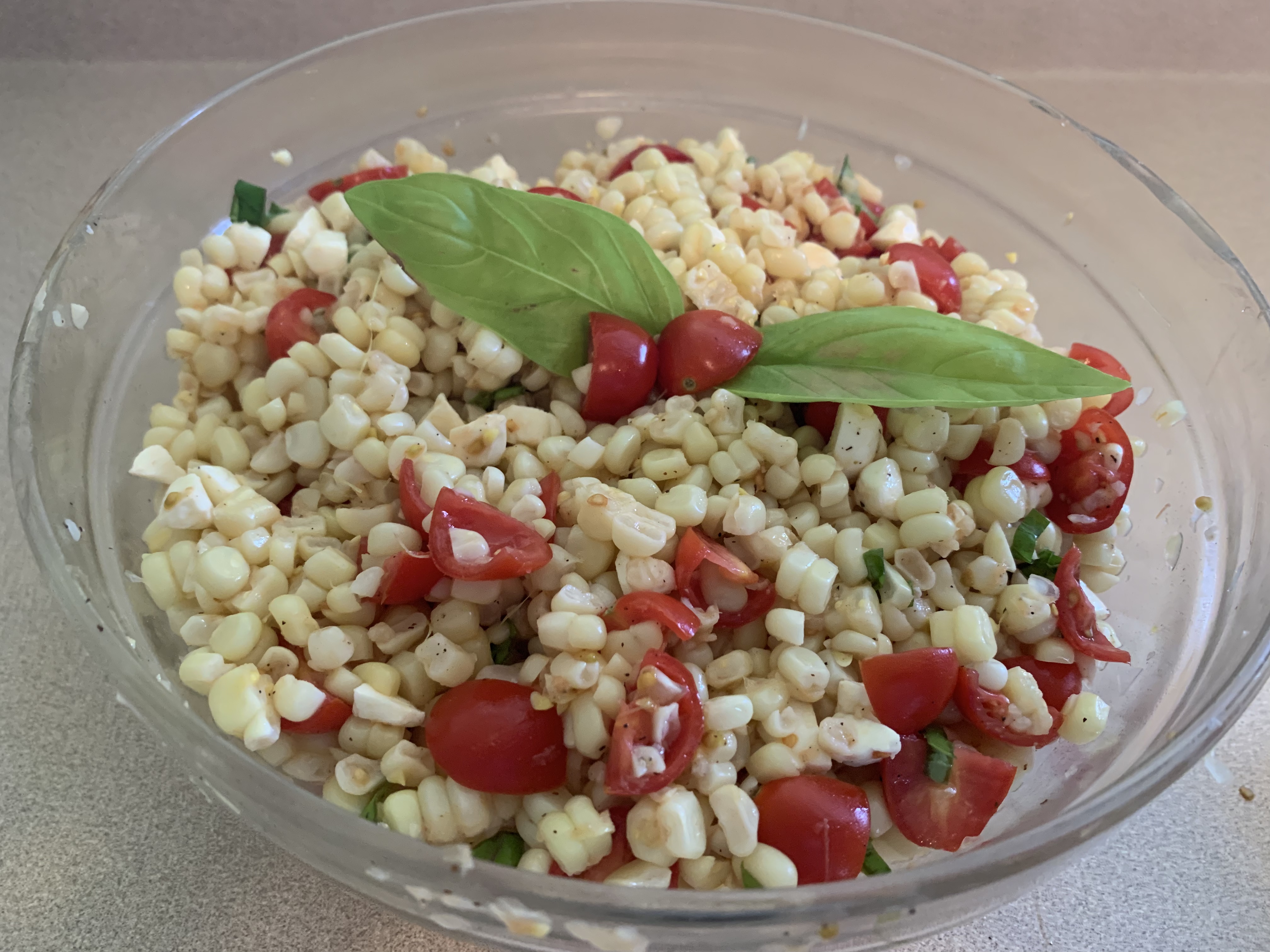- Break up corn into a large bowl. Add tomatoes, mozzarella and basil. Mix well.
