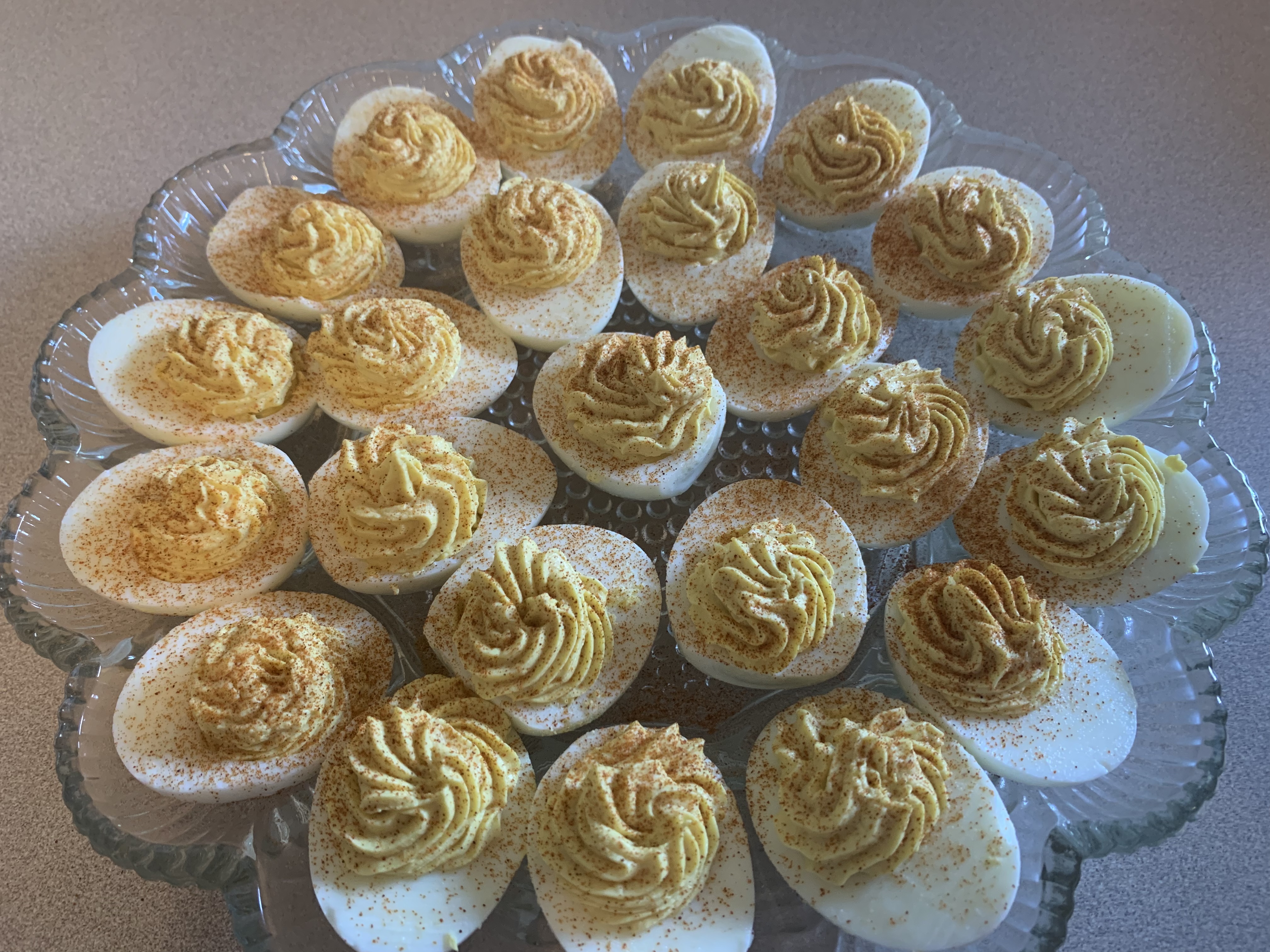 - Fill each half of egg with mixture using a spoon or a piping bag fitted with a wide star tip.