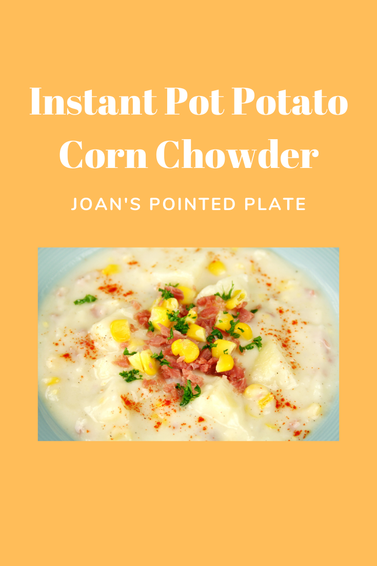 Add the chicken broth, frozen corn, chopped potatoes, onion, garlic, salt and pepper into the insert of the Instant Pot. Stir together. Cover with lid and set the valve to the sealing position. Select manual setting and adjust pressure to high. Set the timer for 15 minutes.