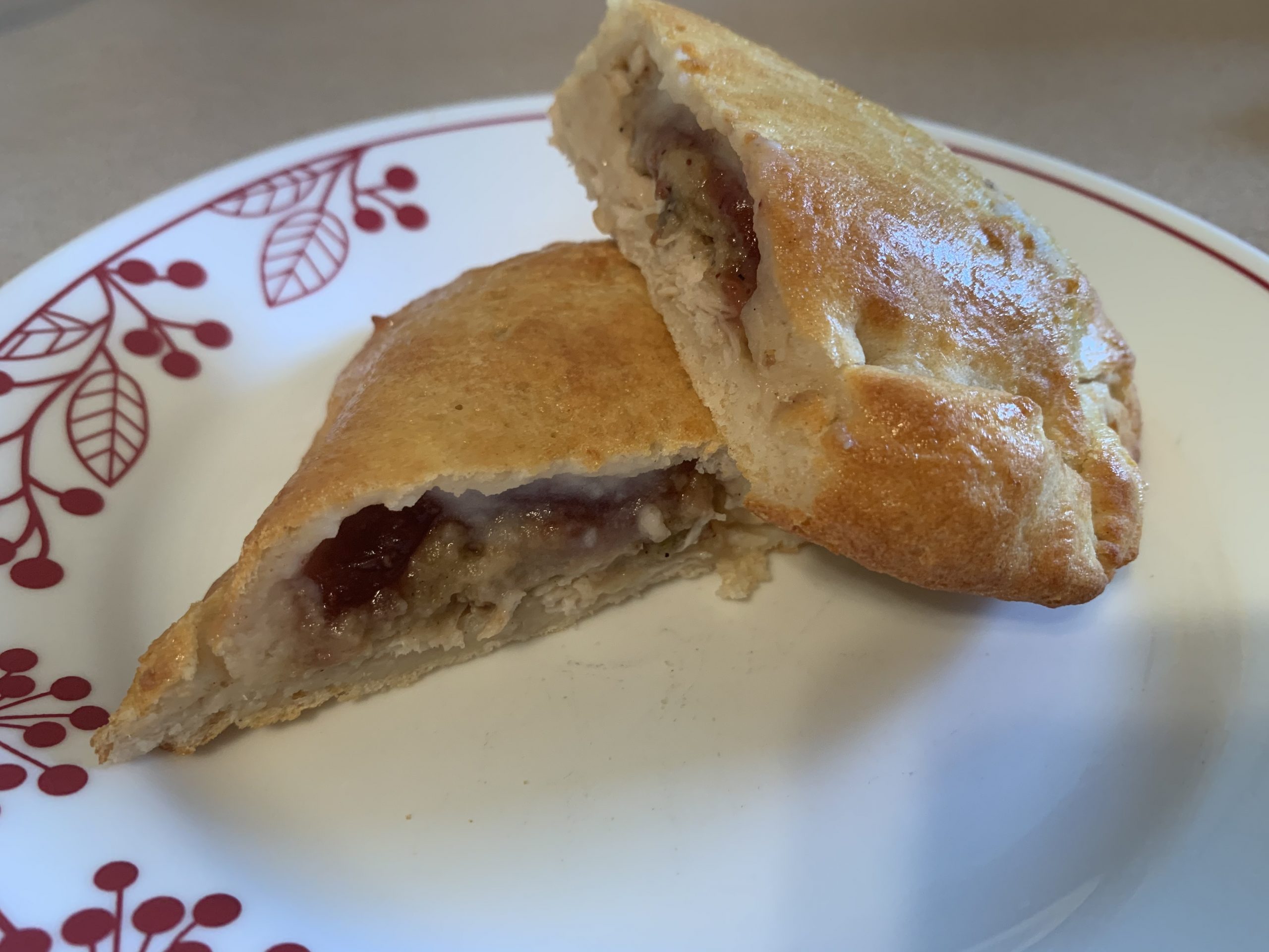 - On half of the circle, layer turkey, gravy, stuffing (I warm mine a bit), mashed potatoes, cranberry sauce