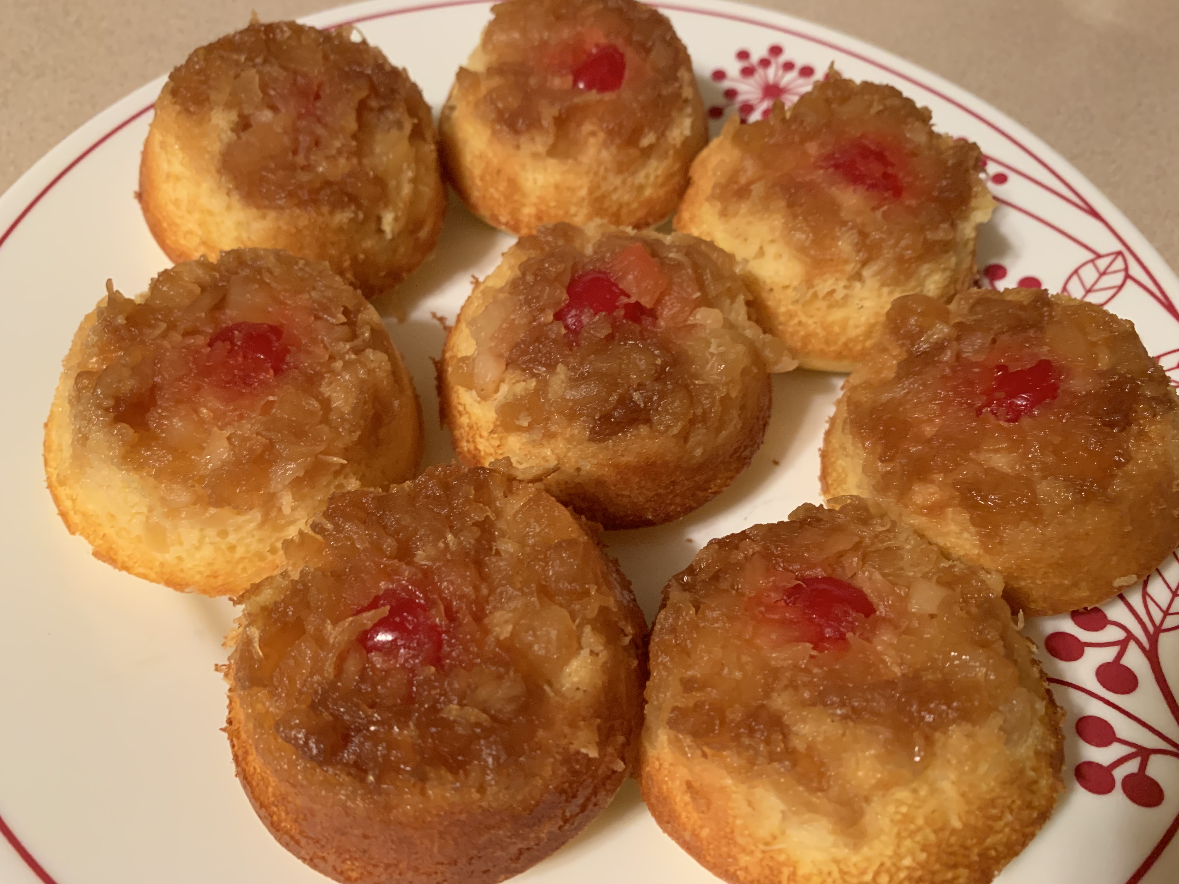 Pineapple Upside Down Cake Pancake Muffins / Uncategorized / By admin Joan Pineapple Upside Down Cake Pancake Muffins Print Recipe Pin Recipe Servings: 9Course: Breakfast Ingredients Ingredients 15 oz can crushed pineapple, divided, juice drained and 2 Tbsp reserved (will not use entire can)9 maraschino cherries9 tsp Brown Sugar1 cup Birch Benders or Kodiak PROTEIN pancake mix (I prefer Birch Benders)2 eggs1 tsp baking powder1/2 cup milk1 tsp vanilla or cake batter extract
